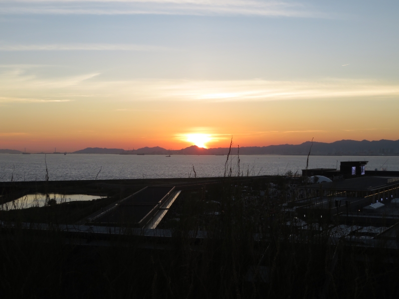 大屋根リングから夕日 左に明石海峡大橋