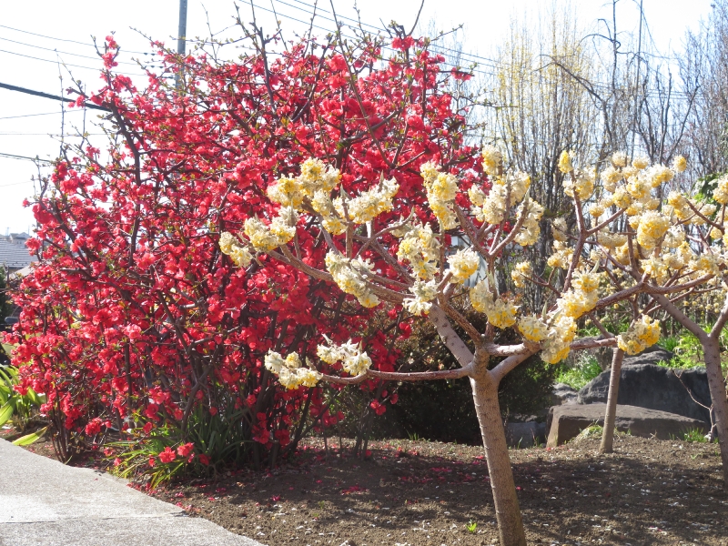 常泉寺門前 ボケ(赤)とミツマタ(黄)